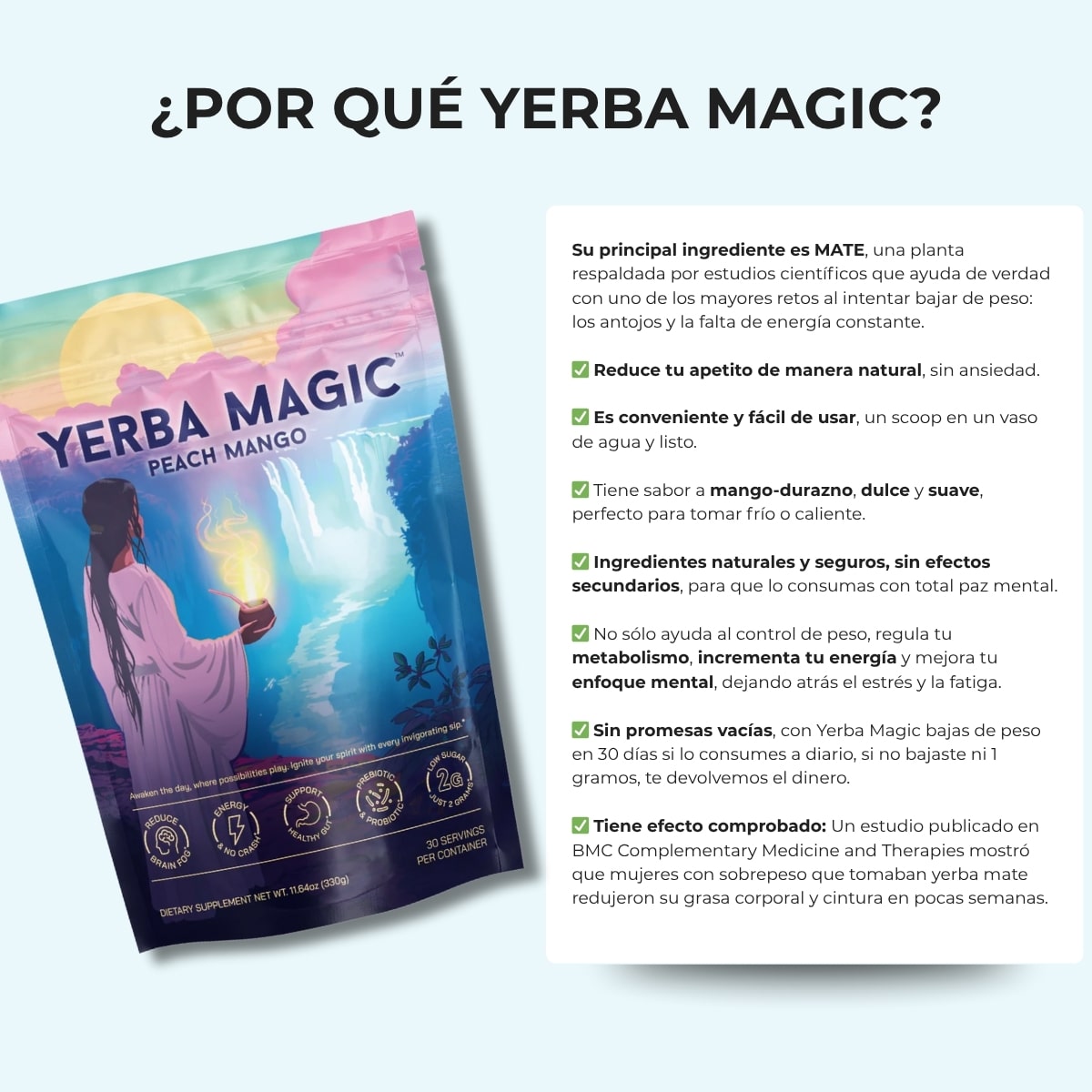 Está diseñado para mujeres que ya han probado muchas cosas sin resultados. Yerba Magic combina ingredientes respaldados por ciencia (Yerba Mate, L-teanina, Lion’s Mane, prebióticos y probióticos) que: